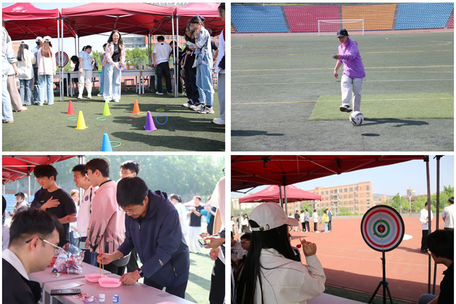 比赛间隙,休闲区设置的趣味小游戏吸引了众多师生踊跃参与。从人气高涨的“妙手投环·鸿运争锋”套圈比拼、欢乐无限的“蒙眼铲铲乐”挑战,到紧张刺激的“趣味投飞镖”与“精准射门·绿茵挑战”竞技,再到别出心裁的“诗韵传新·文思竞速”项目和考验细腻手感的“巧拨玻璃珠”游戏,每一项活动都独具特色。大家在轻松愉快的游戏中放松身心、增进交流,现场气氛热烈,其乐融融,为本次运动会增添了一抹亮丽的色彩。
