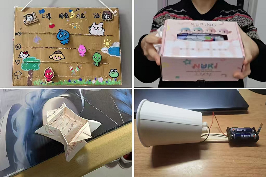 活动中,各宿舍充分发挥创意,将生活与学习中的废旧物品改造为实用好物。大家以草稿纸、外卖袋、快递箱、废旧纸杯等闲置物品为材料,通过裁剪、折叠、拼接等简单手法,制作出收纳盒、挂袋、装饰摆件等多样好物;其中204宿舍将废弃演算纸做成稳固实用的桌面垃圾箱,实现废纸就地“变废为宝”;205宿舍巧用纸杯搭配简易电路组装手电筒,兼具趣味与科普性;312宿舍则利用瓦楞纸箱打造日程板,帮助大家合理规划作息。同学们全程坚持简约环保原则,借助裁剪、折叠、拼接等方式,让废旧物品焕新出彩,既展现了动手能力,又体现了节约意识。