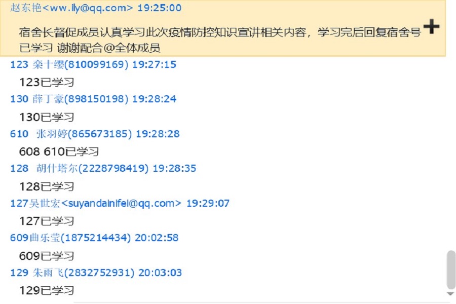 活动伊始,赵东艳介绍了当前的国内疫情状况:截至11月15日24时,31个省(自治区、直辖市)和新疆生产建设兵团报告新增确诊病例22例。这恐怖的新增数量让我们明白了疫情防控的重要性。随后,赵东艳指出当下的疫情状况仍然十分紧张,因此同学们不应有所懈怠,应当坚持落实好各项防疫工作。紧接着,赵东艳向大家介绍疫情防控的四项基本工作,包括做好个人防护、保持健康的生活方式、不瞒报缓报、注意卫生四项内容,并向同学们介绍了科学具体的防疫知识。然后,各宿舍的宿舍长在认真学习班群内发布的防疫知识后,督促宿舍其他同学进行学习。当本宿舍所有成员完成学习后,由宿舍长进行工作汇报。全体成员态度积极,很快便完成了防疫知识的学习。最后,赵冬艳再次强调了疫情防控的重要性。本次会议圆满结束。